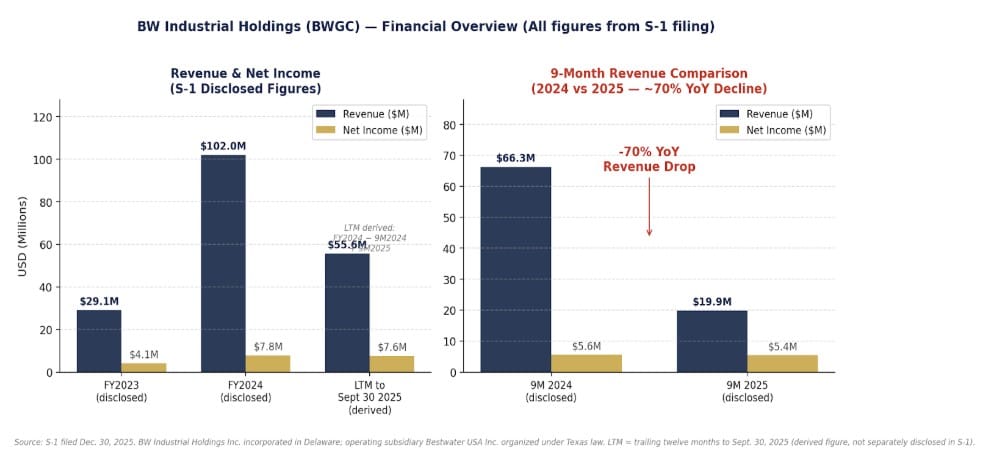 All figures sourced from BW Industrial Holdings S-1 filed December 30, 2025. LTM (trailing twelve months to September 30, 2025) is a derived figure: FY2024 revenue of $102.0M minus nine months ended September 30, 2024 ($66.3M) plus nine months ended September 30, 2025 ($19.9M) = $55.6M. This figure is not separately stated in the S-1.