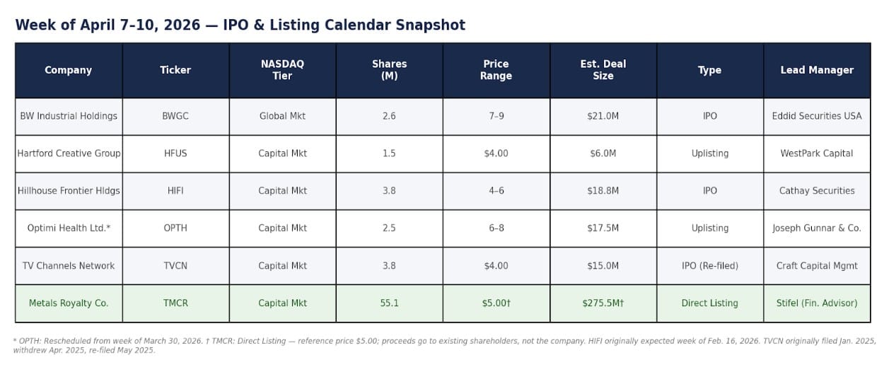 It is a busy week on the IPO calendar — and a turbulent one in the broader markets. Six offerings are slated to price or begin trading this week, ranging from a modest $6 million digital marketing uplisting all the way to Metals Royalty Co.'s $275.5 million NASDAQ Capital Market Direct Listing; the week's marquee transaction by implied deal size, and by far its most complex in structure.